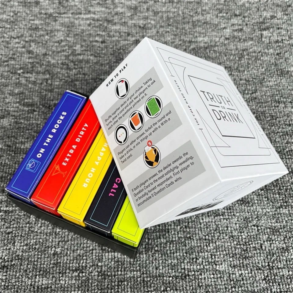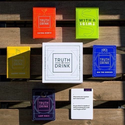Truth or Drink is a series of card games that contains 5 games packed into a single box. it includes: 1.On the rocks: Chill questions for mixed company with just enough of a bit to help you loosen up together.2. Extra Dirty: Cringeworthy adult-themed questions that pair nicely with adult beverages.3. With a Twist: Cut though the hard to swallow questions with these zesty, strategic twists in the gameplay.4. Happy Hour: Only good times allowed with these feel-good questions for you and your drinking buddies.5. Last Call: Warning, do not play this questions unless its very late and you have got nothing left to lose.